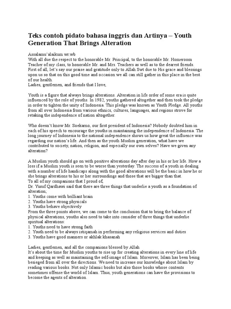Furthermore, we, specially send our peace and salutation to our prophet muhammad saw, his messenger and his servant. Kumpulan contoh teks pidato bahasa inggris dan artinya dibawah ini diambil dari berbagai sumber, ditujukan sebagai referensi bagi para siswa sd, smp, sma atau mahasiswa yang mendapatkan tugas dari sekolah maupun artinya pidato bahasa inggris tentang islam dan artinya terus di update. Nahbila kamu sedang mencari teks pidato bahasa inggris dan bahasa indonesia tentang kejujuran untuk anak sekolah di sinilah tempatnyapidato ini bisa digunakan oleh anak sd smp atau sma. Contoh pidato bahasa inggris singkat tentang islam. In the name of allah, the beneficent and the merciful.